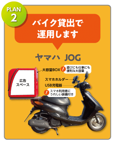 弊社規定の50ccスクーターをご購入頂き運用する、新しいプランです。
