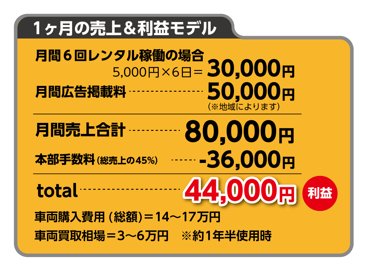 プラン2で運用した場合の1ヶ月の売上モデルになります。こちらの数字はあくまでも参考値です。立地などによって左右されますので、まずは弊社担当までご相談下さい。