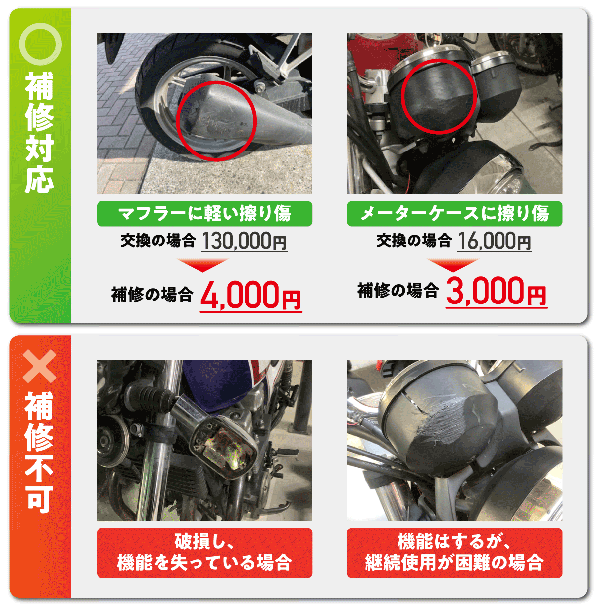 一例ですが、400ccネイキッドで右(マフラー)側に転倒時の場合の部品+工賃表は下記の通りです。(青色は補修対応) ※金額は税別です。